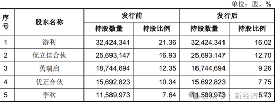 本次发行后,游利直接持有公司 16.02%的股份,第二大股东优立佳合伙持有12.7%的股份;第三大股东英瑞启持有9.26%股份;优正合伙及李欢分别持有7.75%及5.73%股份。