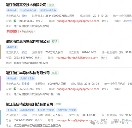 但是,企查查显示,靖江市欣硕机械制造有限公司疑似被邵佳李欢夫妇实际控制。冉冉芯披露的联系邮箱为huangyanhong@jiajiaprecise.com,名称与合伙人靖江市欣硕机械的股东黄艳红的拼音吻合;而该邮箱后缀为靖江佳佳精密机械科技有限公司的备案网站。不仅如此,使用同一邮箱的公司还包括靖江市欣硕机械制造有限公司、靖江佳晟真空技术有限公司、张家港佳惠汽车配件有限公司、靖江佳仁半导体科技有限公司、靖江佳佳精密机械科技有限公司,这些公司的主要股东或实际控制人均为邵佳李欢夫妇。