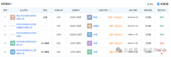 天眼查显示,方辉名下共有6家公司,大多以甘泉命名,其中有两家公司与先锋精密存在投资人上的关联关系。