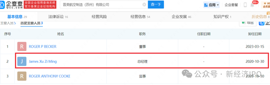新经济IPO注意到,普美航空制造(苏州) 有限公司曾经的总经理叫James Xu Zi Ming,后者直到2020年10月30日才辞去普美航空制造(苏州)总经理职务。