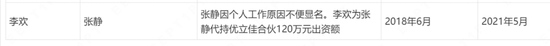 2021 年 4 月,张静因个人原因主动选择退股,李欢的配偶邵佳以350万元对价承接张静所持优立佳120万元合伙财产份额。张静持股4年获利230万元。