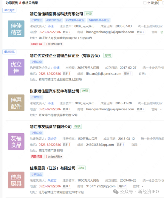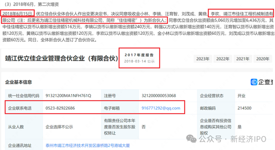 根据招股书披露,靖江优立佳企业管理合伙企业(有限合伙)2017年成立时,合伙事务执行人为游利,2021年前先锋精密将优立佳合伙定位内“内部股东”,此后变更外“外部股东”。但是,蹊跷的是,优立佳合伙2017年年报中所留联系邮箱为916771292@qq.com,该邮箱为邵佳、李欢夫妇控制的多家公司的联系邮箱,如张家港佳惠汽车配件有限公司、靖江佳佳精密机械科技有限公司、靖江市金佳缝纫机械销售有限公司等。