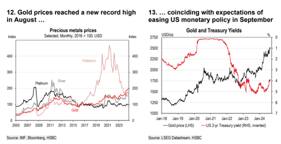 黄金价格在8月份创下历史新高,超过2500美元/盎司,美元疲软以及市场对美联储降息的预期是主要推动因素。汇丰银行预测美联储将于9月降息25个基点,并在11月和12月再降息25个基点,2025年将降息75个基点。