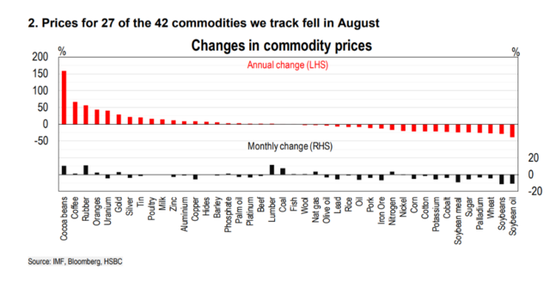 在汇丰追踪的42种大宗商品中,有27种在8月份出现了价格下跌。